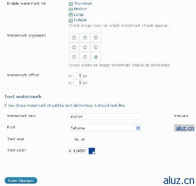 第一个选项是给多大的图片加水印。我选择给中等的缩略图(常用)和原始图片(Fullsize)加水印,其他缩略图均未加。 第二是设置水印添加在图片的什么位置,一般设置在图片的右下角。 第三是设置水印距离图片的边缘有几个像素,我设置成5个像素的距离。 第四是设置文本的内容、字体、大小、颜色。 这些都设置好后,点击“Save Changes ”按钮,就可以保存更改了。