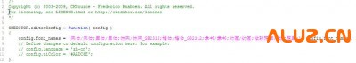 安装后默认的情况下只有英文字体的选择,如果想添加中文字体,则找到插件目录 .\wordpress\wp-content\plugins\fckeditor-for-wordpress-plugin\ckeditor下的配置文件config.js: